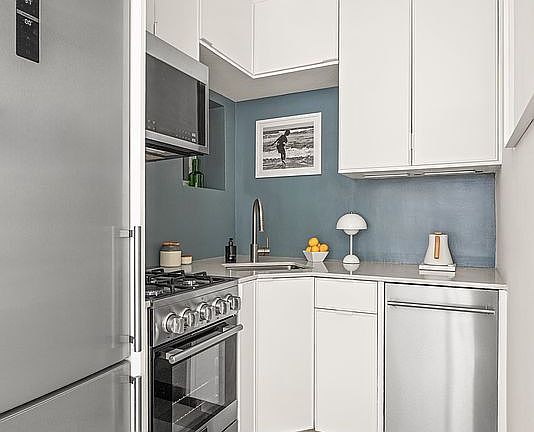 The open and bright living room is filled with natural light from a southern exposure and showcases beautiful details: soaring 10.5-foot ceilings, exposed brick, beautifully refinished hardwood floors, a working fireplace, deep closets, and expansive overhead storage. The sleek, custom-renovated kitchen is outfitted with stainless-steel appliances (including a dishwasher), stone countertops, and a new range, offering both functionality and style.