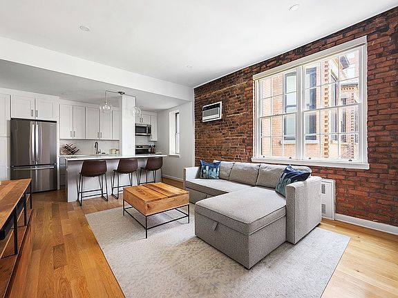The sun-filled, west-facing living room is a standout, showcasing exposed brick, newly