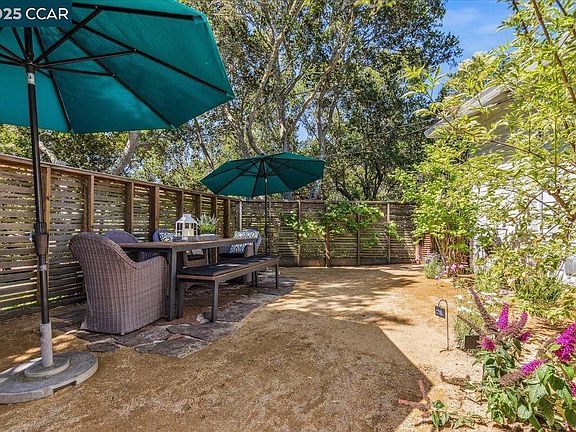 Enchanting! Orinda Country Club charmer on a peaceful hilltop lane. Single-story, low maintenance. Updated kitchen and baths, golf course vistas, and al fresco dining in the butterfly garden. Updated kitchen is jewel-box beautiful, w quartz counters, glazed tile, and a sink facing the hills through a garden-box window and vintage cottage door. New range is a chef's JennAir dream; cook while chatting with company and watching the evening sunshine. Every room has a beautiful outdoor connection. Generous primary suite w wrap-around windows, bay window seat and french doors, primary bath w quartz double vanity and designer accessories. Bedroom 2 is cheerful, bedroom 3 is oversized enough for multiple purposes. A fourth room, three steps away across the back deck, has been art studio, man cave, movie and gaming den, and guest quarters -- truly multi-purpose. Outdoors find multiple enchanting spots -- porch seating with star jasmine, a country table amid butterfly garden and grapevine, barbecue patio and drinks under the trees, and an 800-square-foot deck with views for miles. You have to see it in person, and be enchanted.