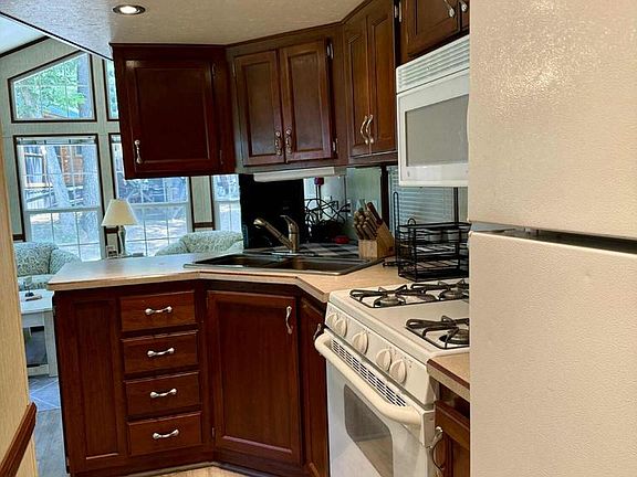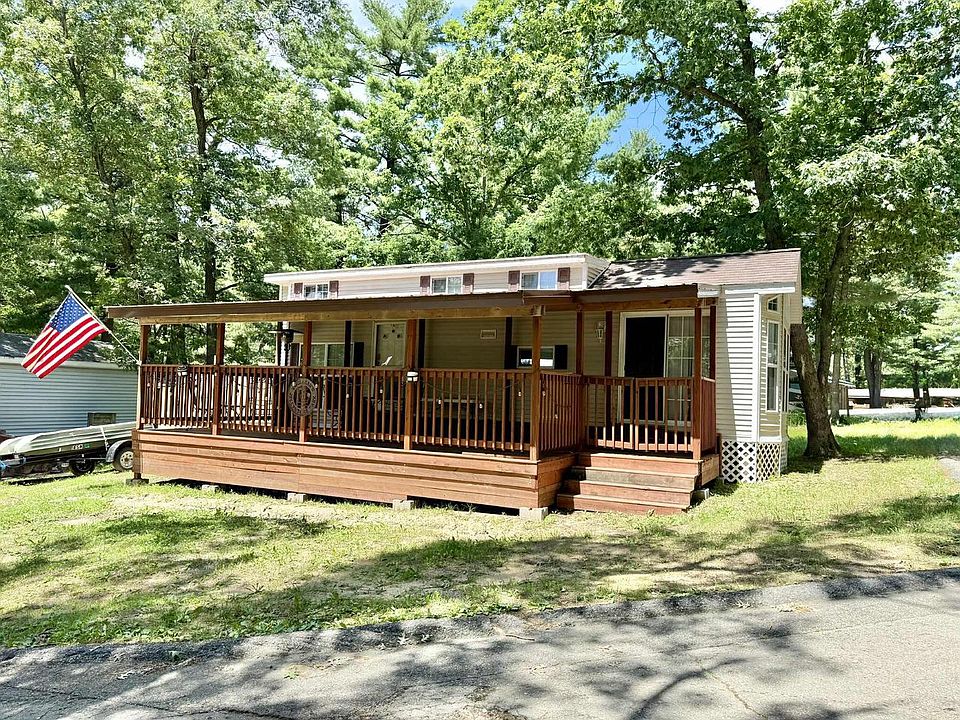 Welcome to the perfect getaway or seasonal home nestled on a desirably located corner lot in Jellystone Park! This 2006 park model features 2 bedrooms, one on the main and one cozy loft-style bedroom ideal for guests, kids, or extra storage and additional loft space. Inside you'll also find a bright and open layout featuring a kitchen, dining area, and living room filled with natural light ideal for relaxing after a day of fun at the waterpark. Step outside onto the huge covered front deck, a standout feature perfect for morning coffee, evening BBQs, or simply relaxing, rain or shine. This turn-key spot is perfect for making lifelong memories. Whether you're looking for a seasonal escape or a place to entertain, this park model has it all!