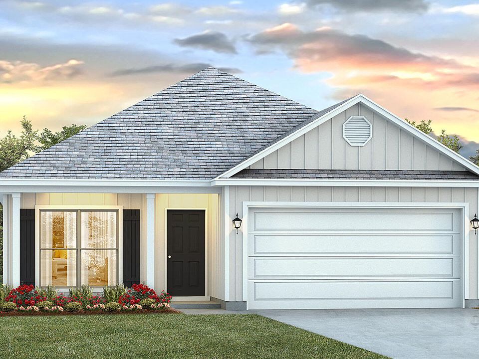 Welcome to 135 Dama Del Mar Way, new home at Caballeros Estates at Hombre in Panama City Beach, Florida. This home is ready for move in and has three-bedrooms, two-bathrooms with a flex space just off the entry hall. This is space illuminated by a large picture window and it could be used as a home office or a formal dining room. Continuing through the entry hall you enter an open concept living area with a kitchen and breakfast area as well as a large family room with vaulted ceiling. The kitchen is accented with upper and lower cabinetry, a center island and plenty of counter space. The white cabinetry complements the elegant quartz countertops.