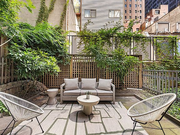 On the fifth floor, there are two more bedrooms, both featuring spacious terraces. One terrace faces south, while the other has a large wraparound area to the north, offering stunning views of the Midtown skyline and the Chrysler Building. The northern bedroom boasts a lovely corner position with plenty of windows. Both bedrooms on this floor share a full bathroom with a window.
