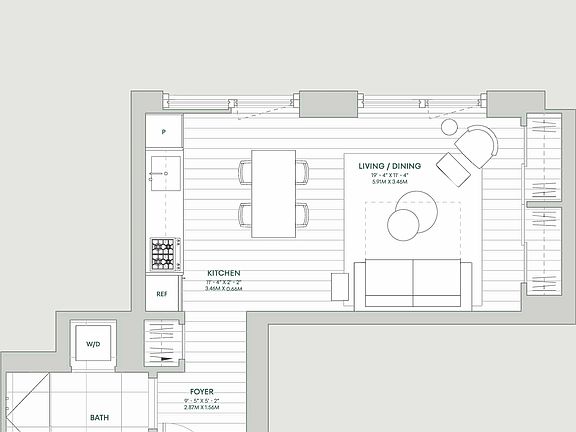 Residence 14B is a bright, north-facing 478 sq ft studio featuring 10-foot ceilings, floor-to-ceiling windows, and a smart, efficient layout with ample storage.