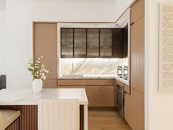 The deisgner kitchen showcases honed Calacatta marble countertops and backsplash, fluted light-oak cabinetry with bronze accents, a hidden pantry/bar, and premium Gaggenau and Bosch appliances.