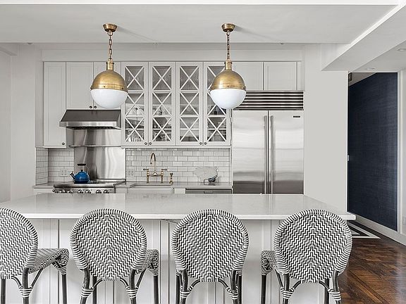 The great room is majestically proportioned, with an open island kitchen, custom built-in banquette dining and play area with built-in ceiling speakers throughout, and a large living room with multiple seating areas and stunning Manhattan views. The two bedrooms in the sleeping wing across this great room are each king size, with views onto the Brooklyn Museum and Brooklyn Botanic Garden. The views within are equally charming: high end lighting fixtures from Visual Comfort throughout, with designer wallpapers from Dorothy Draper, Galbraith & Paul, Farrow & Ball, Phillip Jeffries, Scalamandre, and Sister Parish, and custom window treatments (all blackout in bedrooms) with fabrics by Quadrille and LuluDK, all add to the grace and functionality that convey with this classic home.