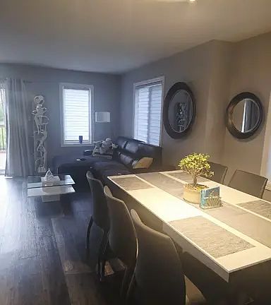Stunning, modern, open concept living space is ready to become your home. The main floor with an attached covered garage and walk-in coat closet also includes an additional den/office/play-room with double doors. Laminate floors span the main floor. which also includes a private walk-out deck. An island, in the beautiful kitchen with gorgeous cabinetry is great for entertaining or gathering around for dinner. This 3+1 bedroom home includes a master bedroom that will not disappoint. A large walk-in closet with an en-suite, complete with his and her vanities is just perfect. A spacious laundry room on the upper level with lots of counter space makes everyday living a breeze. Lots of closets, storage space and natural lighting make this home a treasure perfect for you. Nestled in the heart of the community with nearby parks and schools the main floor and upper level of this end-unit townhome is move-in ready and waiting for you. The basement is unfinished and includes a walk out into the backyard which backs onto green space for additional privacy. For only $2700 + utilities this remarkable house is waiting to be your home.