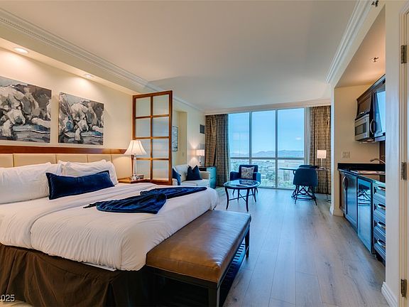 This panoramic mountain-facing suite offers stunning views of Topgolf and MGM’s newly redesigned Palm Tree Beach Club! Unit has recently been updated with fresh paint throughout, along with LVP flooring installed! Fully furnished and turnkey, it features a kitchenette with granite countertops, stainless steel appliances, two-burner cooktop, microwave, refrigerator, and sink, plus a built-in entertainment center, closet with safe, and extra bedding. The oversized bathroom includes double sinks, Jacuzzi tub, and walk-in shower, creating a spa-like retreat. Comfortably sleeps four with a king bed and pullout sleeper sofa. Owners and guests enjoy three private heated pools & spas with cabanas, fitness center, lounge, bar, concierge, valet, Starbucks, and laundry facilities. Connected to MGM Grand, Lazy River, fine dining, casino, and Grand Spa. Rental options include the onsite program, Airbnb, or third-party management, making this an ideal investment or vacation getaway.