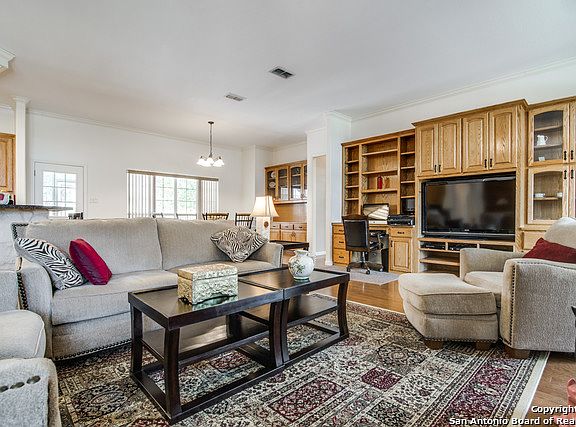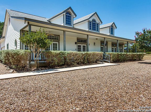 Single Family Detached - Boerne, TX Classic Hill Country Architecture on 5 tree studded acres welcomes you home to big front porches that invites you into an open floor plan with gleaming hardwood floors. Built in bookshelves accent the entry that is open to the large living area with rock fireplace flanked by french doors. Great study area adjoins the living area and flows into the dining area with built-in hutch. Chef's kitsch boasts a rocked breakfast bar, gas cooktop, custom cabinets and large pantry. Split master is light bathed with fre