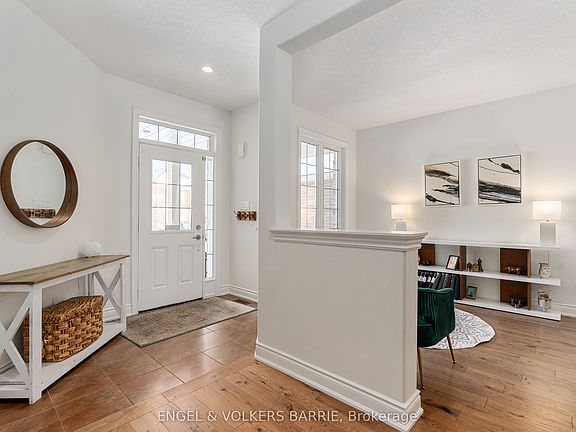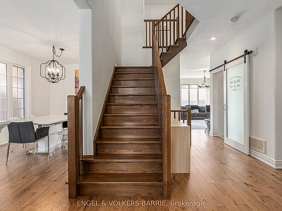 Welcome to this stunning Grandview Homes-built property in one of South Barries highly sought-after neighborhoods. This home boasts over 3,500 total finished square feet of beautifully designed living space, backing onto a peaceful park with breathtaking west-facing sunsets. The main level features a chefs dream kitchen with granite countertops, a large island with bar seating and a built-in bar fridge, stainless steel appliances, tile backsplash, valance lighting, pot lights, pendant lighting, and a built-in microwave. The family room offers a cozy gas fireplace, while the living/dining room combination is perfect for entertaining. The main floor laundry room includes designer tile floors, stacked laundry, and quartz countertops. Step out from the kitchen to a deck overlooking the backyard oasis, complete with an in-ground saltwater pool, stone patio, and full fencing for privacy. Hardwood floors extend through the main and upper hallways, with elegant maple stairs, wood railings, and pickets. Upstairs, the primary suite features hardwood floors, a spacious walk-in closet, and a spa-like ensuite with a glass shower, stand-alone tub, large-format tile floors, and two vanities with granite counters. Three additional bedrooms, all with cozy carpeting, provide ample space for family or guests. The lower level offers laminate flooring throughout, a large bedroom with a walk-in closet, a 3-piece bathroom with heated tile floors and a tiled shower, and an expansive rec room with a gas fireplace, large windows, and walkout access to the backyard. With its fully fenced backyard, west-facing views, and proximity to top schools, parks, trails, Wilkins Beach, shopping, and easy access to Highways 11 and 400, this home offers luxury living in a prime location. Don't miss this opportunity to make it yours!!