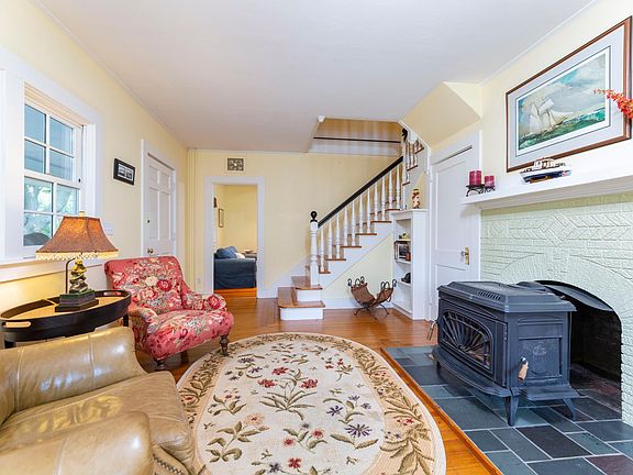 There is a butlers pantry leading to a dining room and living room with a wood stove. A sun porch is off the dining room. Laundry and a full bath is on the first floor. The master bedroom has a small sitting area and a master bath. The second bedroom has a queen bed and the third bedroom has 3 twin beds. There is another full bath on the second floor. There is also a guest house above the garage with a small living room and kitchenette, and an office, large TV, and trundle bed on the second floor to sleep 2 guests. Immaculately kept. Perfect Shoreby Hill location, within walking distance to the library, playground, shopping and the Jamestown Arts Center.