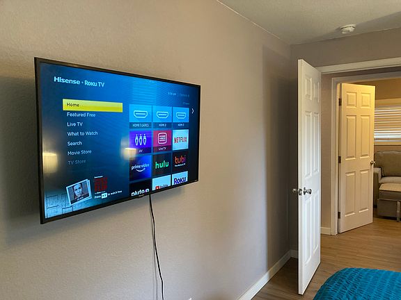 The main bedroom features a comfortable king size bed, 45-inch Roku TV, nightstands, lamps and closet. A smaller second room has a couch that pulls out to a full size bed with memory foam mattress topper and 32-inch Roku TV (no nightstands, lamps or closet). Both bedrooms have a wall-mounted mini-split HVAC system, which allows you to set your preferred temperature in each room using a remote.