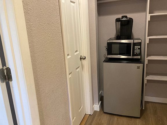 The full bathroom has a tub and shower. In the hallway you'll find a Keurig coffee maker (coffee is provided), microwave and mini fridge. This area is designed for enjoying a morning cup of coffee or reheating leftovers from our great local restaurants. It is not a full kitchen and is not set up for cooking.