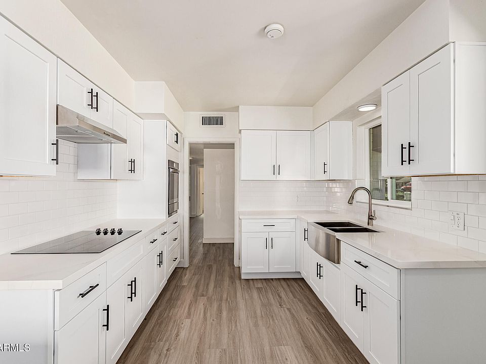 Immaculate and move-in ready 4 bedroom 2 bath home in Mesa with irrigation!. Extensively renovated with new paint inside and out, new vinyl plank flooring and new carpet. Upgraded kitchen with new cabinets, quartz counters, and new stainless appliances including an electric cooktop and a wall oven. You'll also find new bathrooms, new lighting, and even new vinyl frame windows and glass sliding doors. There is a 2-car carport, plus a long driveway for additional parking. Flood irrigation is available to help keep your water bill low. No HOA and close to local dining and amenities, this one's the perfect home for you!
