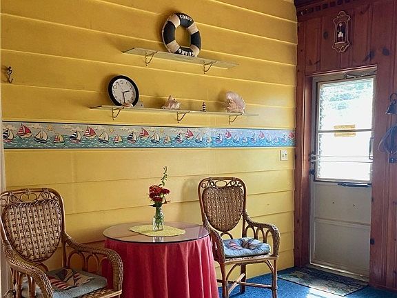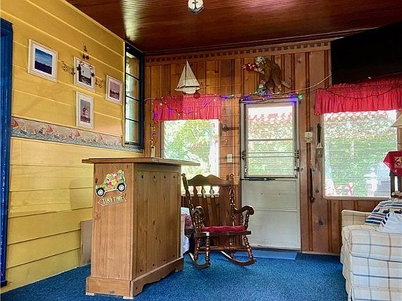 Fire pitHobby roomBuilt in bench seatingLarge barDeck and trellisWood burning stoveNatural woodwork