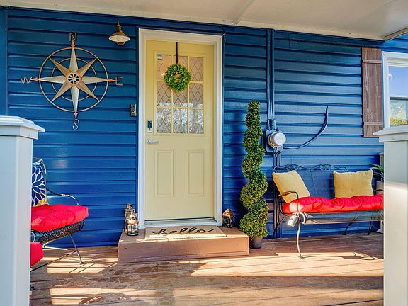 Fenced yardMetal roofOpen layoutBold navy vanityStylish kitchenStainless appliancesSubway tile backsplash