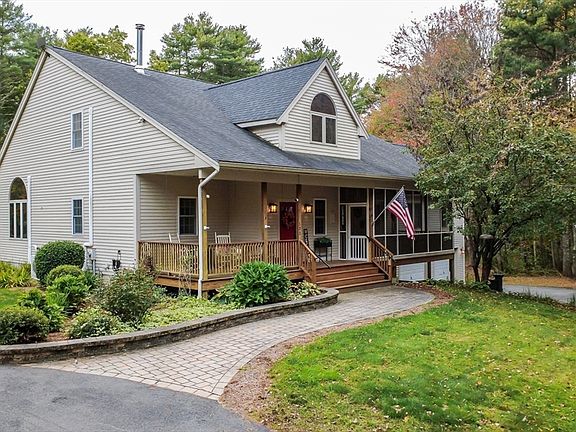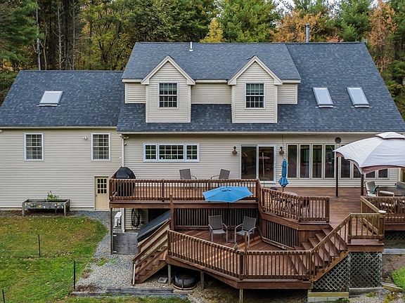 Welcome to your own private retreat! Set on 3.4 acres and tucked away at the end of a private driveway, this custom 3-bedroom, 2.5-bath Cape offers space, serenity, and stunning craftsmanship throughout. The inviting farmer’s porch sets the tone as you step into the foyer and into the impressive, open-concept living area. The spacious living room features vaulted ceilings, a cozy wood stove, and a slider leading to the multi-level deck overlooking your peaceful backyard. The living room flows seamlessly into the beautifully designed kitchen, complete with an oversized island, stainless steel appliances, and ample cabinetry for all your storage needs. A dedicated dining area connects to the show-stopping great room, highlighted by its floor-to-ceiling stone gas fireplace, cathedral ceilings, and gleaming hardwood floors—a true centerpiece of the home. First floor bedroom and half bath. Upstairs offers another bedroom, full bath with laundry and primary suite.
