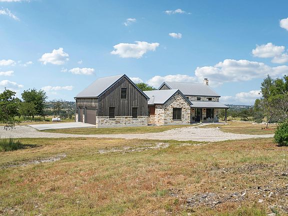Hilltop scenic vistas, nature’s artwork on display. Endless horizons and country charm await just 1.4 miles north of US 290 and 15 miles west of Fredericksburg. Nestled in Scenic Vista Estates, 135 Scenic Vista Drive blends pastoral grace with refined sophistication, epitomizing Hill Country living. This 3,566 SF retreat on 5.27 acres reflects a classic Lone Star homestead with modern design. The native limestone exterior, ebony timber cladding, and standing seam metal roof exude timeless character. A wide veranda, supported by timber posts, invites evenings overlooking oaks and distant plateaus. At twilight fiery amber hues transform the estate into a striking Texas tableau. A three-car garage accommodates off-road vehicles or gatherings. Dual covered patios (937 SF total) expand living space by more than a quarter. The open layout centers on a 1,011 SF great room with 22 foot peaked ceiling. A masonry fireplace anchors one side; broad oak planks and factory-style lighting complete the setting. Large casement windows and clerestories flood the space with light and panoramic views. The chef’s kitchen boasts a quartz island, wraparound counters, ample storage, Sub-Zero refrigerator/freezer, 48 inch Wolf cooktop with double griddle, dual commercial exhaust, built-in Wolf oven, and steam/convection oven. The 825 SF owner’s retreat captures dawn over the ridges from a loft or through French doors to the patio. Its ensuite offers a seamless glass shower and elegant soaking tub. A 300 SF guest suite with wardrobe alcove and adjacent bath, plus a utility zone, complete the main level. Upstairs, a nearly 700-sq.-ft. private suite includes a full bath and stunning Hill Country views. It could be a media room. Built with Structural Insulated Panels, the home ensures superior energy efficiency, comfort, durability, and reduced heating/cooling costs. This is more than a residence—it’s a Hill Country sanctuary with magazine-worthy design and sweeping vistas.