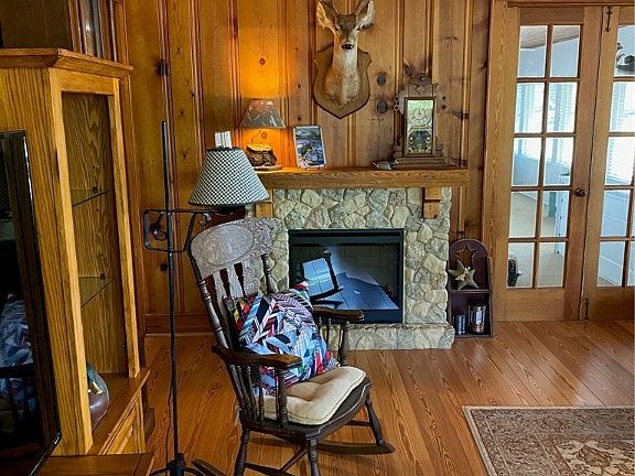 The home consists of mainly pine tongue and groove on the walls and ceiling for that warm and comfy atmosphere. There is a fireplace in the dining space, 2 bedrooms and 2 bathrooms.