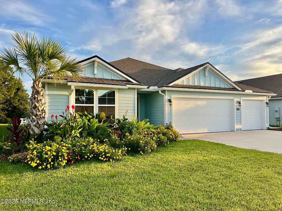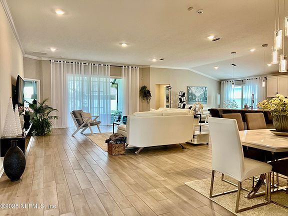 You will fall in love with this Newer (2022) Contemporary designed home in Rock Springs Farms!!! 3BR + Office, 3BA, 3-Car Garage, over 2,300 SF. Features include soaring 12' ceilings w/ crown molding, recessed lighting, wood-look tile floors throughout, quartz/granite counters, & upgraded garage/patio shark flooring. Gourmet white kitchen w/ 42'' cabinets with crown molding, SS Whirlpool appliances, quartz island, walk-in pantry, tiled backsplash & deep sink. Spacious primary suite w/ tray ceiling, dual walk-in closets, quartz dual vanities & large tiled shower. Enjoy screened patio w/ 9' sliders, insulated garage doors, utility sink, water softener, gutters, 30-yr Architectural shingles Roof. Transferable EV charger lease (220V)will provide free charge at nights, holidays and weekends. Community amenities: walking distance to heated pool , playground, park, picnic area. Prime location near I-95 & US-1, just 15 min to beaches & 20 min to Historic St. Augustine Downtown. No CDD