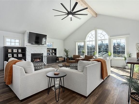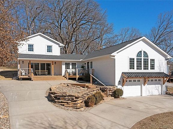 Here is the Lotawana property you have been waiting for! This gorgeous newly remodeled second tier home is nestled in the very peaceful waterfall cove. It is an easy walk or golf cart ride right across the street to your very own covered single well dock with a boat lift. The home sits on 1 1/2 lots which provides ample parking with a huge circle driveway, two garage spaces and a large back yard with tons of mature trees and shade. The expansive new front deck has ample space for entertaining, grilling and relaxation. Inside the home you will fall in love with the formal living room that has oversized windows that flood the home with natural light and a wood burning fireplace for the winter months. The kitchen boasts granite counter tops, stainless steel appliances, a large pantry, mud room and huge kitchen island. The rest of the main level offers a dining room, office, sitting area, half and full bathrooms and three bedrooms and laundry room. The largest bedroom on the main level is used as a family room currently but would be a great second primary suite as it has a closet and laundry room or it could also be used as a bunk room. Upstairs is an amazing primary suite with tons of windows, lake views, huge walk in closet and bathroom. This is an absolute must see house that is just a golf cart ride away from all of Lotawana's amazing restaurants and bars or take your boat to Marina 27 for dinner!