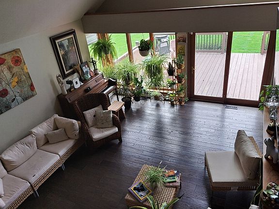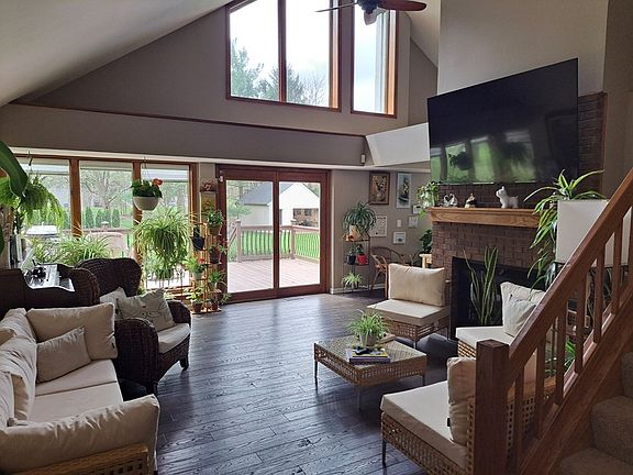 Beautiful home on a spacious one-acre lot with a Master Suite on the main floor. The kitchen features remodeled cabinets, marble countertops, newer stainless steel appliances (2022), a double-door pantry, and ceramic flooring. The living room has vaulted ceilings, large windows for natural light, a brick fireplace, and access to a large deck - perfect for entertaining. A cozy dining room sits right next to the kitchen. The master bedroom includes a walk-in closet and a private en-suite bathroom. NEWLY REMODELED BATHROOM. Upstairs, a second-floor bedroom with a skylight adds extra charm. The spacious basement offers newer grey carpeting, a flexible fourth bedroom/den/bonus room, and a large storage/laundry area with a washer & dryer (2018). Additional highlights include brand new hardwood floors on the main level, six-panel pine and white doors, and a beautiful yard with mature trees. There's also an additional heated garage with an opener - ideal for hobbies, outdoor activities, or extra storage. Recent updates include a furnace with media air cleaner (2018) and a new roof (2020). This stunning home is ready to welcome you!