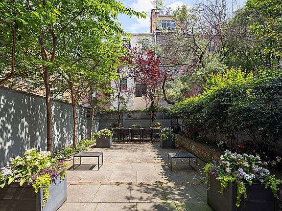 The garden is perfectly appointed. It includes a grill with prep space and storage; a dedicated dining area; a variety of trees, flowers, and planters; and stone pavers. It is functional, peaceful, and private.