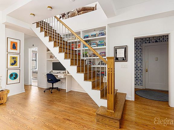 The spacious living room faces over 79th Street and is filled with light from the South. Adding a beautiful counterpoint is exposed brick on the walls. Across from the dining room a lovely staircase leads to the second floor of the duplex, behind the staircase is a brilliantly designed bookshelf and display case, and under the staircase is a home office for practical use. Down the hall is a newly renovated windowed full bath featuring Thasso marble, Grohe thermostatic fixtures and Swiss Madison sink and commode. Adjacent to that is the first of four over-sized bedrooms each filled with light, open views and custom closet design systems.