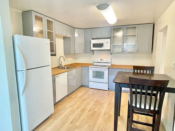 Good size contemporary kitchen with refrigerator, stove, oven, built in microwave, dishwasher, disposal, and plenty of cabinet, counter space. Room for table (owner also willing to leave the existing table and 2 bar stools).