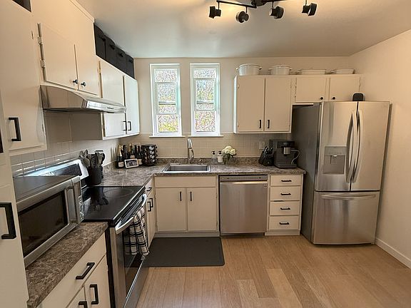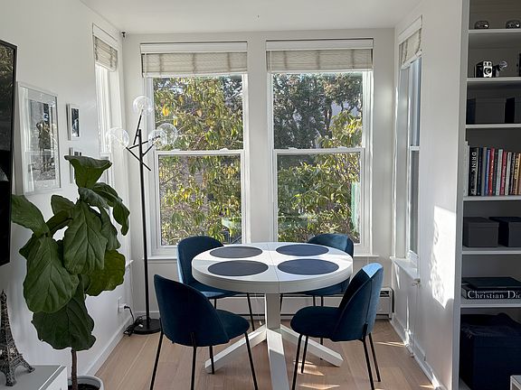 Tree-lined streetFresh paintLarge picture windowsWhite cabinetryOpen living spaceStainless-steel appliancesBuilt-in shelving