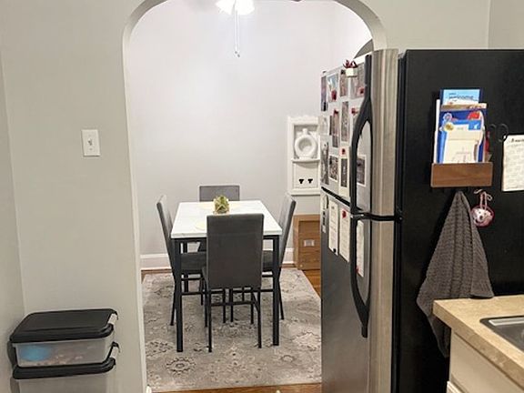 Large kitchen with stainless steel appliances (gas stove, refrigerator, dishwasher, microwave). Hardwood floors in the dining room, living room, and bedroom. A walk-in closet in the living room and built-in storage outside of the bathroom. Updated windows throughout and two window AC units provided.