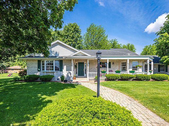 As you pull up to your dream ranch, you're immediately struck by its curb appeal. The wrap-around porch, adorned with ornate columns and intricate woodwork, creates an enchanting welcome as you approach the home. Not to mention the home is fully landscaped out front, setting the stage for what lies beyond. Entering through the front door you are greeted by a spacious entryway that exudes a sense of elegance and comfort. The vaulted ceilings add a touch of grandeur, while the soft lighting creates a welcoming ambiance. Just off the entryway, you'll find a cozy guest bedroom and a full bath, perfect for accommodating friends and family. The living room, with its vaulted ceilings and views of the backyard, is the heart of the home, offering plenty of space to relax and entertain. Through the double sliding doors, you step onto a lovely wood deck, ideal for outdoor gatherings and enjoying the fresh air. Nearby, French doors lead to a versatile third bedroom or office space, complete with a charming cherry bookcase and plenty of natural light. The master bedroom is a true retreat, featuring a vaulted ceiling and a built-in wall arch that adds a touch of sophistication. The master en suite is equally impressive, double vanities, a jacuzzi bathtub, walk- in closet, and a spacious walk-in tile shower. The kitchen is a chef's delight, boasting an open concept design, high-end appliances, and Amish custom cherry cabinetry throughout the house. The large granite island is perfect for meal prep and casual dining, while the adjacent dining area offers wrap-around windows that frame views of the surrounding landscape. Convenience is key in this home, with a sizable laundry room equipped with a sink and ample counter space. A powder room near the garage entrance ensures easy access for guests. From the meticulously finished garage to the leaf guards on the gutters. There is thoughtful design touches throughout, this home is sure to impress even the most discerning buyer. Call and schedule your showing today and experience the magic of this property for yourself!