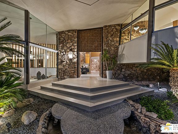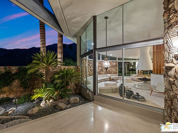 The Alexander Residence 1960 - William Krisel architect. Prolific Southern California developers and society patrons Robert Helene Alexander of the Alexander Construction Co. commissioned the spaceship-like dynamic winged home as there personal residence, a testament to engineering and daring avant-garde design that attracted Look Magazine in 1962 to declare it The House Of Tomorrow. 1967 the newlyweds Elvis and Priscilla Presley famously leased the house lending it the name The Elvis Honeymoon Hideaway Home. A provocative entry path ushers you into an interior sunken party pad flanked by angular stacked stoned walls, glass, and a low-slung curved upholstered banquet embracing a futuristic shaped fireplace hood and floating hearth. A raised dining platform connects to a custom circular kitchen and private den with fireplace, the grounds unfold seamlessly through a wall of glass to the expansive exterior terracing, pool, and breathtaking mountain views.A lavish primary suite is reached via a grand staircase to a private glassed perch featuring panoramic views. A generous dressing room/bathroom is concealed by built-in wardrobe closets centered around a circular tub, and an intimate balcony is accessible allowing for a discrete observation deck. All bedrooms, three lower and one upper, are en-suite, two sharing an exterior terrace. In 2021 the home went under a thoughtful renovation with restored original architectural details of stone and poured terrazzo floors, bringing the house back to it's original intent and receiving a Class-One historic designation. 2023 brought additional improvements of a higher level of luxury and sophistication. This iconic house is in the Vista Las Palmas neighborhood and is the largest Alexander-built home with the largest pool and best lot. This Special Home Is Being Sold with many of the pieces seen in the photos. Prior to viewing the property, any potential buyer must be qualified with proof of funds or letter of qualification by known financial institution