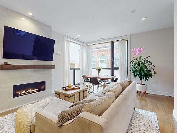 Set on a quiet, tree-lined block in the heart of Wicker Park, this 2-bedroom, 2-bathroom home offers modern features, refined finishes, and thoughtful design in a boutique three-unit building. Floor-to-ceiling windows with north & east facing exposures highlight the wide, open-concept living and dining area, anchored by a sleek fireplace with custom mantle & full-height tile surround. The kitchen features custom cabinetry, quartz countertops, an island with a waterfall edge, and high-end stainless steel appliances. Tucked away in the back of the unit, the spacious rear-facing primary suite includes a walk-in closet and a spa-like main bath with an oversized steam shower, heated floors, and dual vanity. The versatile second bedroom features a custom Murphy bed, perfect for a home office, gym and guest space. Additional features include hardwood floors throughout, 8' solid-core interior doors, in-unit laundry, a private rear deck, and garage parking. Ideally located a short walking distance from the Damen Blue Line, The 606, and all the shops & restaurants on both Milwaukee & Division, this home offers comfort and connection in one of Chicago's most dynamic neighborhoods.