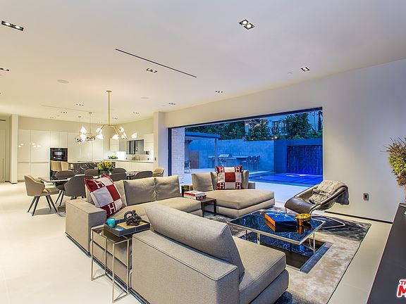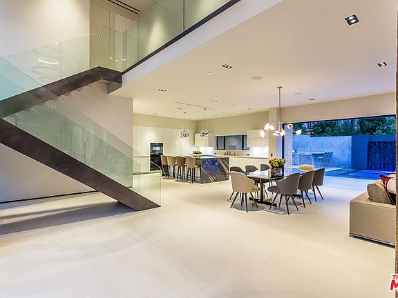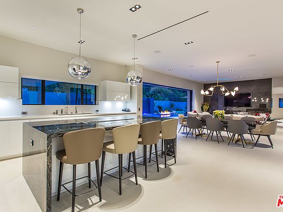 A private, modern oasis awaits you at the end of a cul-de-sac in the lower Benedict Canyon area of Beverly Hills. Recently extensively remodeled in a European style with no expense spared, boasting sleek interiors, sophisticated finishes and soaring ceilings. Over 50 slabs of rare stone throughout, with 22 slabs of Calacatta marble in the Master Bathroom and closet. Custom Poggenpohl glass kitchen features Miele appliances, Dornbracht faucets, elegant white marble countertops and rare, single slab marble island. Acoustic walls surround the indoor movie theatre with Sub Zero beverage center. Full Fleetwood doors and windows seamlessly connect the open concept kitchen and living area to the outdoor living space, resulting in the ultimate indoor/outdoor living experience. Outdoor kitchen with full Lynx range and infinity edge pool with 25ft cascade water wall and fire feature. Full-function Crestron automation system controls the lights, shades, fireplaces, AC, pool, water features and sound system.