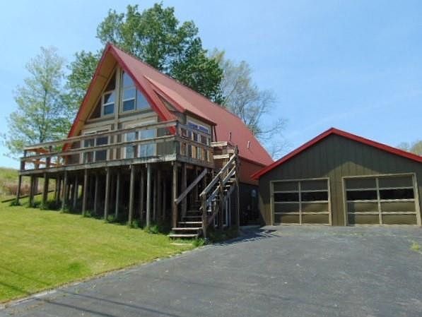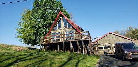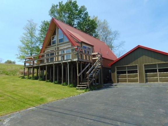 Chalet Home! Natural woodwork offers a cozy cabin feeling, private setting with view of woods & valley, 3 bedrooms, full bath, loft area with handmade cedar railing, full basement, 2 car garage on 2 lots.