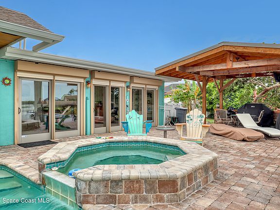 Experience unparalleled water views from this stunning pool home, ideally situated at the intersection of two canals. It features a covered boat dock with a lift, as well as a jet-ski lift, making it an ideal spot for water enthusiasts. The outdoor area is a true oasis, complete with a tiki covered patio, a sparkling pool, and a relaxing hot tub, all surrounded by majestic queen palm trees. Inside, the kitchen is a chefs dream equipped with a natural gas commercial range and oven, a beautifully vented ornate hood, custom cabinetry and gorgeous granite countertops. The kitchen is seamlessly open into the dining and living room areas, offering panoramic views of the water and pool. There are 2 master suits, each equipped with sliding doors that take you outside to a brick paver patio area. This home features Anderson Hurricane Windows and also full hurricane protection with electric powered hurricane shutters. Newer roof as well.