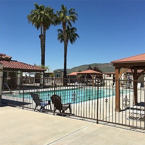 Park Model manufactured home and Lot. Includes with addition (use as family room or 2nd bedroom) carport awning, and deck. Vaulted ceilings, nice built-in cabinetry in bedroom and dining. All appliances, plenty of storage including outside storage shed. HOA includes water, sewer, trash, internet, basic cable, and use of all of the many amenities in this gated community for 55 or better.