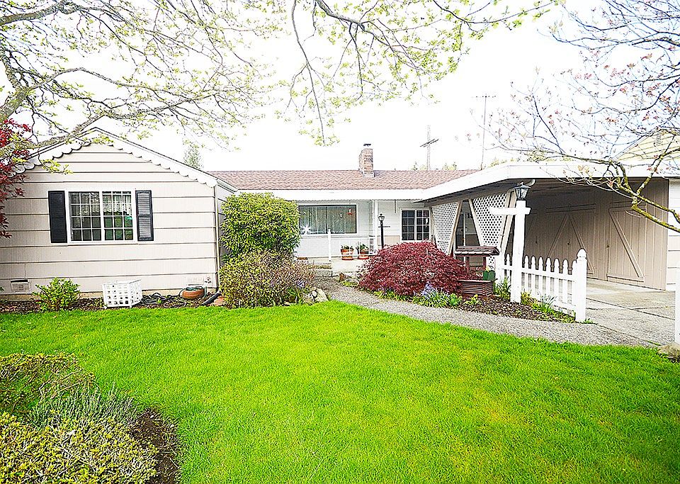 Olympic Hills - Solid Rambler, w/excellent floor plan. 4 good sized bedrooms, 1.5 baths, huge family room off kitchen. Large living room with fireplace, spacious dining room, w/sliding doors to covered patio. Family room has 1/2 bath & 2nd fireplace. long bathroom, w/tile counters. Gleaming Hardwood floors. Carport with storage, can par 2+ cars in driveway. Handy back yard workshop. Corner lot. Quiet neighborhood close to city amenities,shopping,freeways, buses & schools.