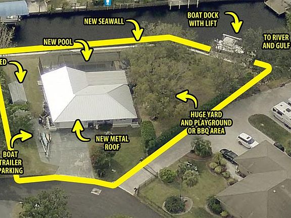 Unrestricted Direct River Access Canal Home with a Brand-New Pool! This stunning property sits on over half an acre of fenced land, offering 195 feet of waterfront on a private street in River Forest, a small boating community of 192 homesites. Completely renovated in 2023, this home features all-new essentials, including a metal roof, water heater, and impact-resistant windows, doors, and sliders. There is extended parking on the driveway for your boat trailer, and the seawall is new as well.