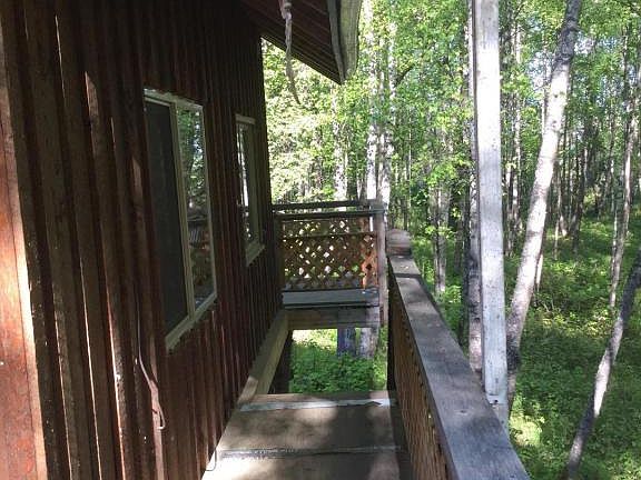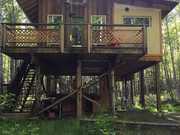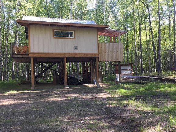 Cabin is located on 3.45 acres with hundreds of uninhabited acreage to the South. Constructed in 1999, the 400 sq.ft cabin is composed of 2x6 wood frame with R21 walls, R31 roof and R36 floor. The living space measures 20 x 20; extending the living space is a 6 x 16 deck on the inlet side and a 8 x 22 ft deck on the West side. Built upon 9 poles and 3 sauna tubes, 10 feet above the ground, allows for two vehicles to be parked under the structure (enclose the area and have a two car garage). Wired with breaker panel, sheet rocked, vapor barrier, tyvek, sided, metal roof, the cabin functions as a complete recreational property. The Honda generator runs the entire cabin with phone that delivery DSL, enabling Wi-Fi, TV, and internet. Cabin is furnished with futon, daybed, loft with box spring and mattress, comfortably sleeping five plus. The wood stove heats the cabin and the propane heater warms the entry and kitchen. New full size propane stove and full size refrigerator and counter space make cooking easy. The new out house and outdoor shower are rustic yet charming. The small tree house, trampoline, and zip-line off the front deck give kids hours of play. The Little Susitna River Boat Launch is just 12 miles away. Beautiful views feature sunrise over of the Chugach Mountains, dip-netting at Fish Creek and Beluga Whale viewing. A perfect recreational get away only one hour from Anchorage.