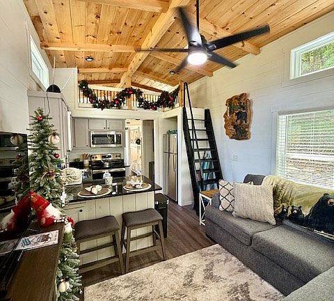 Welcome to this beautifully constructed tiny home, nestled on 3.79 acres of serene landscape. This delightful 1-bedroom, 1-bath residence offers the perfect escape from the hustle and bustle of everyday life. As you approach the home, you'll be greeted by a spacious porch, ideal for soaking in the tranquil atmosphere, looking at the beautiful views, and listening to the gentle sounds of the nearby branch. The thoughtfully designed interior features a cozy primary bedroom complete with two closets. There are also bunk beds downstairs and a loft area that provides extra sleeping accommodations for guests. This quaint retreat is perfect for those seeking a peaceful getaway or a unique living experience surrounded by nature. Don't miss the opportunity to make this enchanting home your own!