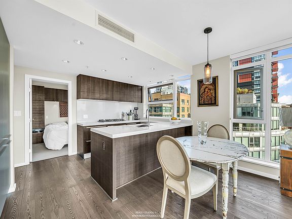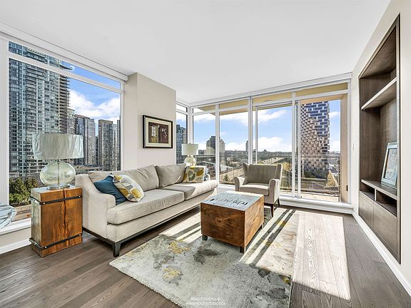Sophisticated city living awaits at The Maddox by Cressey! This bright southeast corner home offers 2 separated bedrooms, 2 bathrooms, a den/office, and a large pantry in a smart, functional layout. Engineered hardwood floors, custom kitchen finishes, gas cooktop, newer Miele/Bosch appliances, California closets, and a built-in entertainment centre add style and comfort, while air conditioning and a heat pump ensure year-round ease. Enjoy 24-hour concierge, gym, sauna, party room, and kids' play area in this well-managed building, just steps to Fresh St Market, London Drugs, cafes, and the seawall.