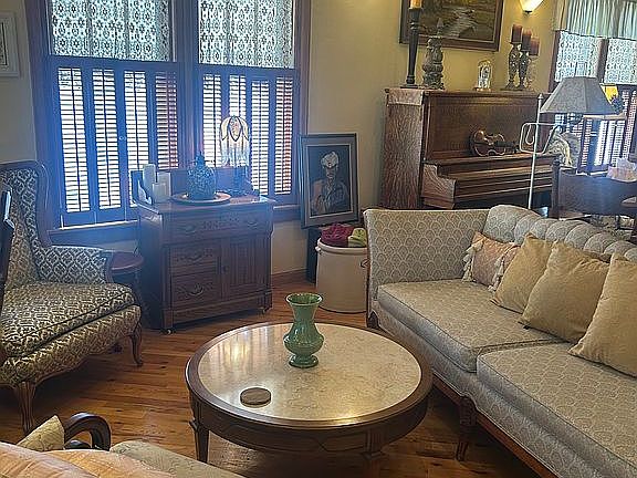 This bright and inviting home features beautiful hardwood floors, natural woodwork, and soaring 10-foot ceilings. A custom wrought-iron spiral staircase leads to a spacious loft — perfect as a media room (with built-in sound system) or potential third sleeping area.