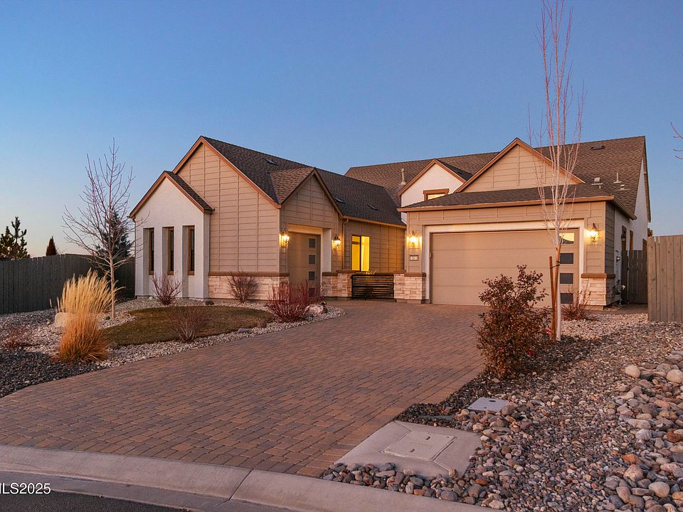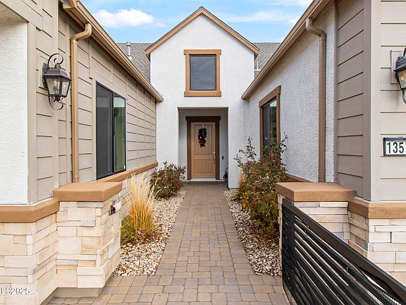 Introducing a luxurious single story residence in the gated community of Ridgeline at Caramella Ranch. Situated on an expansive .27 acre premium corner lot, this 2020-built home blends modern elegance with unmatched comfort, offering sweeping mountain views on one side and sparkling city vistas on the other. Step inside to discover over $180,000 in high-end upgrades, beginning with a chef-inspired kitchen featuring double ovens, a commercial-grade refrigerator, granite countertops, a spacious island, breakfast bar, and a cozy breakfast nook. Whether you're hosting or cooking for two, this kitchen is designed to impress. The open-concept great room is the heart of the home, showcasing 20-foot ceilings, a gas fireplace, integrated home surround sound, and smart curtains. Two expansive sliding doors create a seamless indoor-outdoor flow to the covered double patios—perfect for entertaining or unwinding while taking in the panoramic views. This thoughtfully designed layout includes three generous bedrooms and two-and-a-half bathrooms. The bright and serene primary suite offers high ceilings, a full-size soaking tub, steam shower, dual sinks, and a custom walk-in closet crafted by Closets by Design. Additional highlights include: • Private backyard oasis ideal for relaxation includes a raised deck with Pergola for entertaining and enjoying the beautiful views of Mt. Rose, the Sierras and Downtown Reno. • Spacious laundry room with sink and natural light • Immaculate 3-car insulated garage with direct access to the kitchen • Located in tax-friendly Nevada • Access to community amenities including a clubhouse, pool, and gym This exceptional home delivers refined living in one of Nevada's most desirable settings. Don't miss your chance to experience luxury, comfort, and breathtaking views all in one place. Welcome home to 13510 Water Willow.
