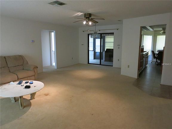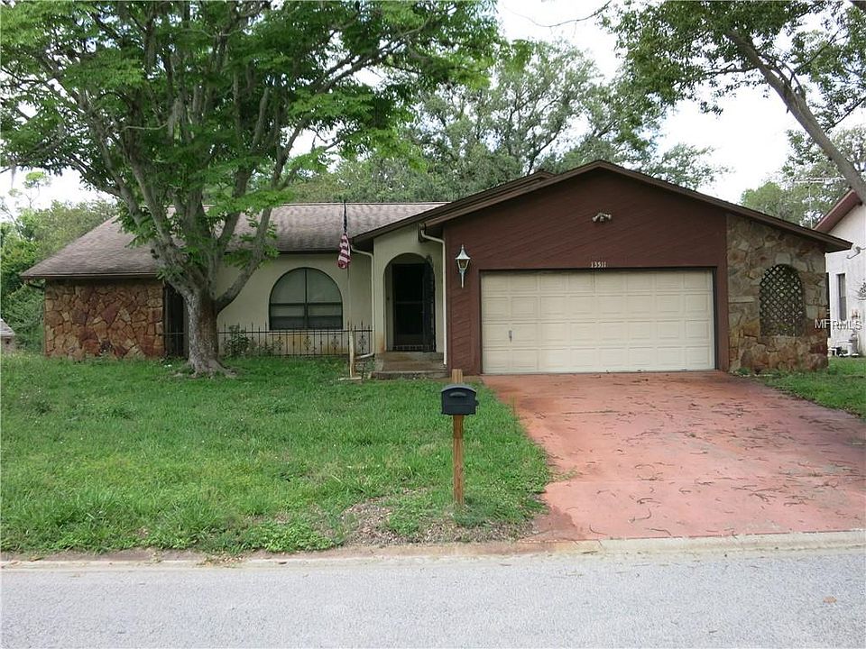 Cute home! Open family/dining room space lives BIG. 2 bedrooms with walk in closets. 2 baths-double sinks in the master! Galley kitchen includes tile floors and solid surface countertops. Smooth top stove along with dishwasher and disposal. Nice space in breakfast area with lots of light from the bow window. Unbelievable carpeted flex room off the back sizing at 10' by 23' that is heated and has A/C and also touts a pass through from the kitchen-perfect for entertaining. Garage is nice size at 20 x 24' deep! Nice yard in front and gorgeous backyard with woods for complete privacy. Unique, covered, screened porch with stone accents off the front...perfect little place to sneak away and read and relax or have your morning coffee. This great home is minutes from Hudson Beach, boat docks and all your Florida fun.