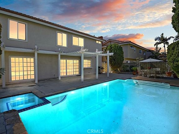 Prime location! Walk to top-rated Cerritos Elementary, this impeccable, well cherished 2-story pool home stands proudly, highlighting its timeless appeal and meticulous upkeep by the same family for years. With manicured, lush greenery and a stunning earthy hues flagstone pathway, the welcoming curb appeal sets the stage for elegance within. Enter the Mahogany double doors entry and be mesmerized by the soaring cathedral ceiling, a bright and open floor plan where natural light pours into the expansive living spaces, creating a seamless flow, perfect for both intimate gatherings and lively entertaining. The inviting living room effortlessly connects to formal dining. The beautiful kitchen is open to a spacious family room. Thoughtfully designed for versatility, the downstairs 4th bedroom has been opened and fully integrated into a family room, transforming the space into a grand, open-concept entertaining area, the bedroom can easily be restored if desired. Multiple sliders off family room and former 4th bedroom invite streams of glorious natural light while creating a harmonious indoor-outdoor connection. These expansive openings extend the entertainment space beyond the walls, offering effortless access to the backyard and enhancing the home’s airy, open ambiance. Plush carpeting covers the living room, dining room, and bedrooms upstairs. Easy-care porcelain tile flooring flawlessly delivers elegance and practicality throughout the kitchen, family room, and bathrooms. Kitchen and family room feature custom-built Oak cabinets, pull-out drawers, Corian countertops and recessed lights. All bathrooms are spotless. The primary shower was recently remodeled, featuring modern subway tiles on shower wall, a built-in shampoo niche, mosaic tile shower base, and new shower doors. Enjoy a spacious, spectacular backyard oasis, where a sparkling pool and spa invite relaxation. A large open patio cover provides a shaded retreat, while expansive low-maintenance concrete areas offer ample space to entertain. Built-in planters add a touch of greenery, and secure block wall fencing ensures ultimate privacy. Other desirable upgrades: New water heater, extravagant plantation shutters, dual pane windows/sliding doors, central heat/air, customized Oak stair rails, durable tile roof, pool heater/lights, finished garage, pull down ladder to extra attic storage at garage ceiling...WITH PRIDE OF OWNERSHIP, TOP SCHOOLS IN A PRIME LOCATION, THIS AMAZING HOME IS A MUST SEE, MUST HAVE