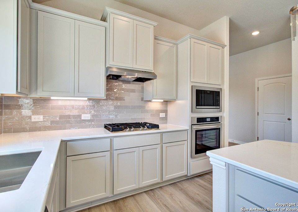 DRB Homes presents the Laurel plan, offering some of the largest homesites in the Veranda community. This home features three spacious bedrooms, a dedicated study with a ceiling fan, a formal dining room, and a two car garage. The kitchen is designed for both function and style with a center island that provides additional counter space, an upgraded layout including a gas cooktop, built in oven and microwave, and an extra twelve inch cabinet for additional storage. The open layout allows for easy flow between the kitchen, dining, and living areas, making this home perfect for family gatherings and entertaining. The owner's suite is designed as a private retreat with a large shower featuring ceramic tile, a relaxing garden tub, dual vanities, and a private water closet. A window allows natural light to brighten the space. Other highlights include a covered patio for outdoor living and ample space throughout the home for comfort and convenience. Residents of Veranda enjoy access to a community pool and park, perfect for leisure and recreation. This new home community in Northwest San Antonio is ideally located near SeaWorld and Lackland Air Force Base, with easy access to Loop 1604, Loop 410, and State Highway 151. The Laurel plan combines quality, comfort, and location to create the perfect place to call home.