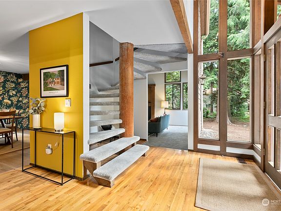 Serene Bridle Trails home with mid-century modern architecture on over 1 acre. Bright living spaces, vaulted ceilings, and panoramic backyard view. Upgraded flooring, new carpet and fresh paint. Ideal for entertaining and play, easy for multi-generational living. Home theatre, "speakeasy" room and built in office. Desirable floor plan with main floor primary room, walk-in closet, and remodeled spa-like bath. Close to parks, shopping, and freeways. Minutes from downtown Bellevue, Kirkland, Microsoft, and Google. Award-winning Bellevue School District. New EV charger and panel, fiberoptic internet available. Must see to experience.