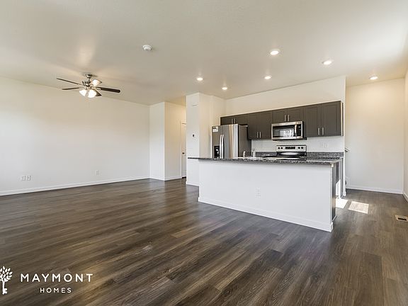 The open-concept floorplan connects the living, dining, and kitchen areas seamlessly, creating an ideal setting for entertaining or winding down at the end of the day. The kitchen features stainless steel appliances, a large island with room for barstools, and plenty of space for cooking and conversation.