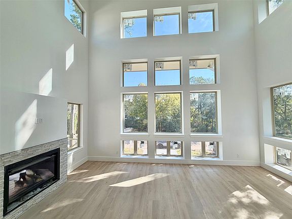 Blending luxury with advanced engineering, this new Cypress home rises 2 feet above the required 8-ft flood level in a wooded horse-trail community with pool, pickleball, basketball and tennis courts. A dramatic 26-ft ceiling with a 25-ft span defines the living and dining area, centered by a gas fireplace for an open-concept feel. The elegant primary bath includes two porcelain accent walls, a freestanding tub and brushed-gold fixtures. The gourmet kitchen offers quartz surfaces, a large vent hood, 10 feet island and a freestanding gas range. The home provides a 2300 sqft carpark and covered entry plus approx. 350 sqft of second-floor porches, for a total area near 5450 sqft. Features include a 15-SEER Carrier heat-pump with two zones, smart thermostats, waterproof vinyl floors inside, a solar-ready TPO roof, EV-charger in the carpark, high-efficiency doors/windows, ceiling fans and Italian/Spanish stone-tile accent walls on the large side porch, fireplace, master bath and carpark.